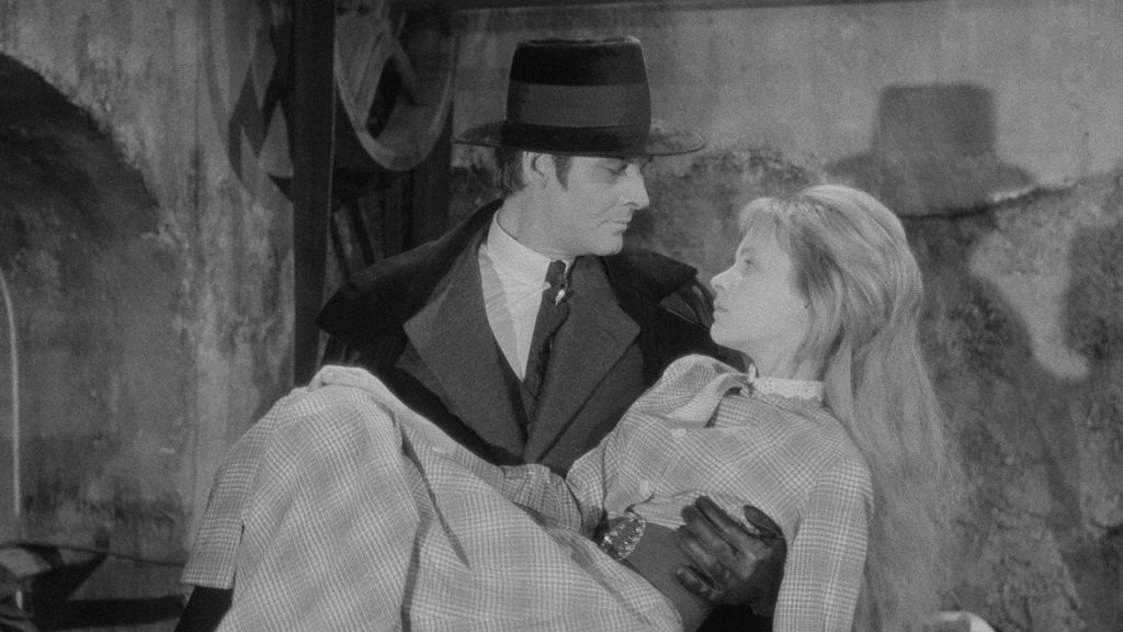 Since Franju took pains to treat the story’s fantastic elements as matter-of-factly as possible, his casting is key. For Judex, the director chose professional magician Channing Pollock, who could not only carry off the character’s signature hat and cape, but also perform the dove trick without the need for cuts or other camera trickery. As the villainous Diana Monti, he cast Francine Bergé, a young actress who effortlessly exuded the pure evil required for the role and looked as much at ease in a pilfered nun’s habit as a black body stocking with a dagger attached to her thigh. Franju’s ace in the hole, however, was Edith Scob (so haunting as Christiane in 1960’s Eyes Without a Face) as Jacqueline, the meekly innocent daughter of Favraux, a corrupt banker targeted by Judex, who seeks redress for the many victims of his unscrupulous business practices.
