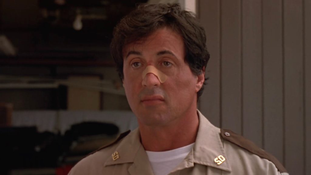 Around the two-thirds mark, Freddy travels to the city to meet with De Niro’s character. The camera follows behind Stallone as he climbs the stairs of a subway station, the shot reminiscent of a fighter walking to the ring. Suddenly, Freddy emerges onto the street and the camera pulls back. The buildings tower above him and New Yorkers rush past as Freddy, out of his element, looks down at a slip of paper and tries to get his bearings. For maybe the first time in any Stallone movie, he suddenly looks very small.