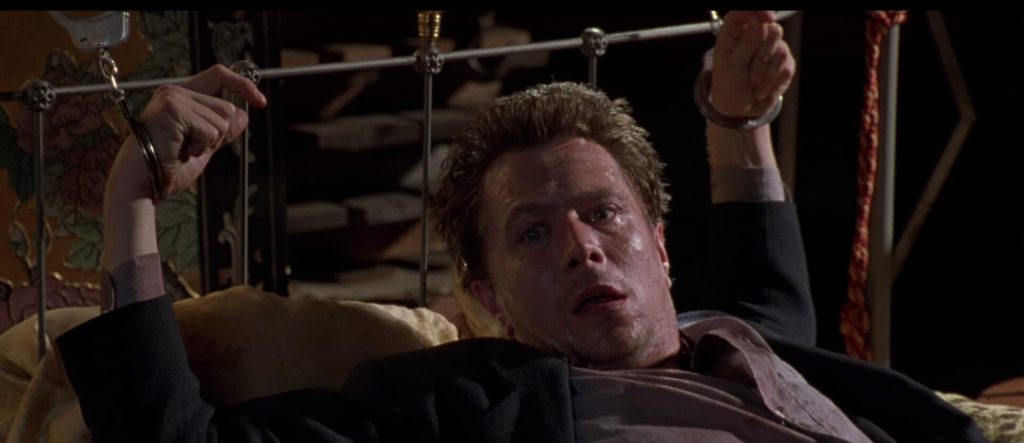Of course, every Elmer Fudd needs their Bugs Bunny, and boy, does that describe Olin’s human tornado of carnal destruction, who sows so much madcap chaos by film’s end that you half-expect the set to come crashing down around her. If Oldman—who at this point in his career was known for playing seedy, dangerous types—is at his unhinged best, Olin is outright feral. To say she steals the film is an understatement: she outright takes it and makes it her bitch. It’s a physical performance in every sense of the word—not only does she wield her body as a weapon in the name of seduction, she actually uses it as a weapon at various points. (During the most impressive set piece, which involves a brutal car crash and Olin’s attempts to extricate herself from the wreckage with her hands cuffed behind her back, the actor performed all her own stunts.)