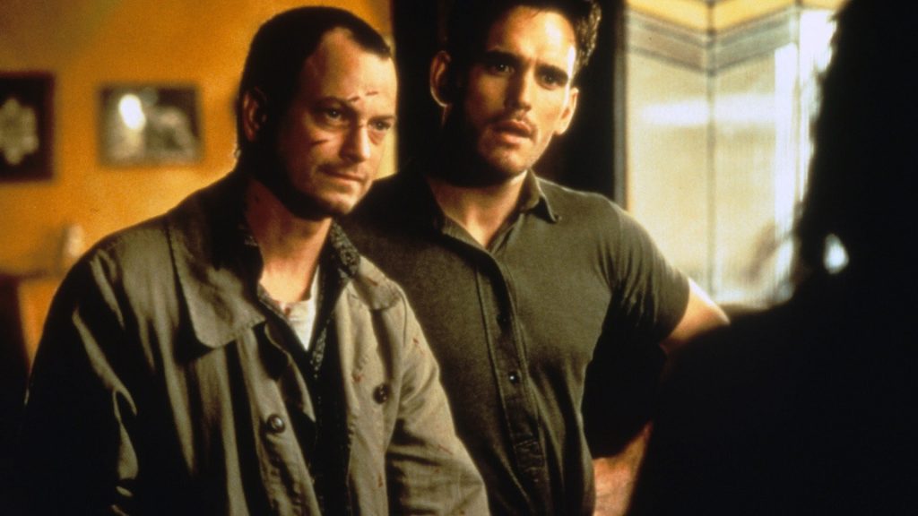 Of course, the dive’s remaining inhabitants reluctantly become hostages, including the lippy barmaid (Faye Dunaway), a young pool player (Skeet Ulrich), a barfly (John Spencer), and a mysterious, French-Canadian businessman (Viggo Mortensen, laying on the accent thick). There’s also the bar’s owner (M. Emmet Walsh, RIP), who’s unfortunately taken out early when he gets into a shotgun-wielding tussle with Law.