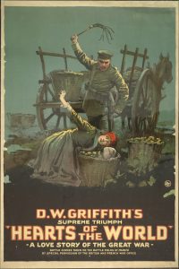 A very clear example of a WWI film as propaganda is Hearts of the World (1918). Motivated to fuel American involvement in the war, the British government reached out to successful American director D.W. Griffith (Birth of a Nation) for a strategic film creation. Although Griffith had access to film shot at the battlefront, he utilized very little of it, opting for staged scenes instead. Mechanized mass murder would have interfered with the glorious, chivalrous image of war the British needed him to project. Griffith said, “Viewed as drama, the war is in some ways disappointing, everyone is hidden away in ditches. As you look out over No Man’s Land, there is literally nothing that meets the eye but an aching desolation of nothingness…. It is too colossal to be dramatic!”