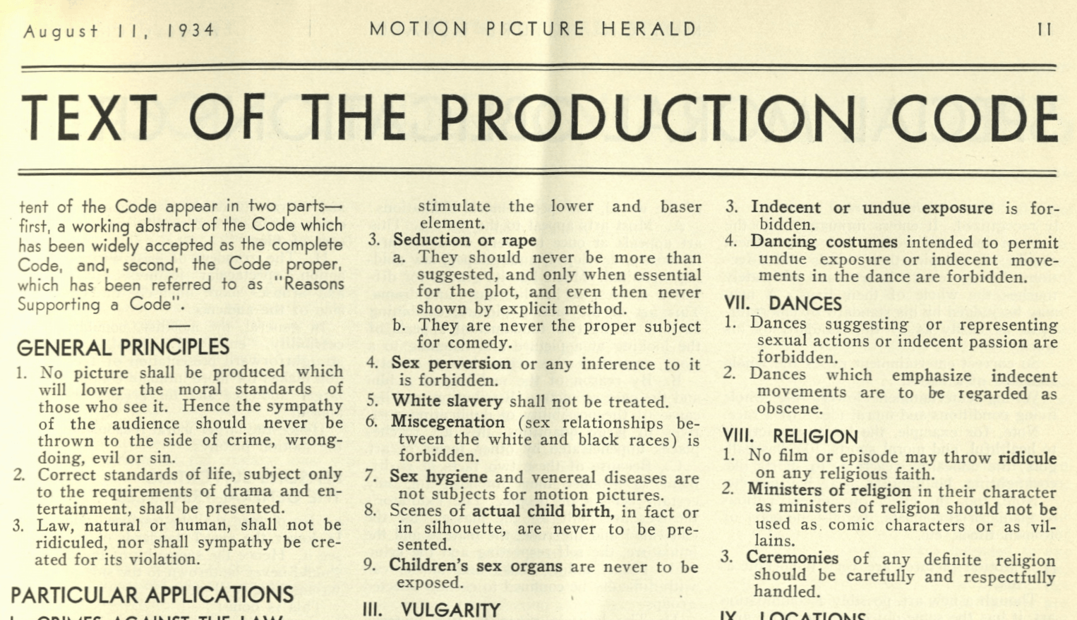 But then the Hays Production Code was established, forcing films to conform to their standards of morality and good taste or risk losing lucrative distribution deals. The Code arose out of a backlash against several high-profile Hollywood scandals, as well as a widespread belief amongst the conversative religious community that films were simply going too far. The new rules for filmmakers were myriad: They couldn’t depict suggested nudity, the drug trade, homosexuality, profanity, mocking of religion – the list goes on and on. Furthermore, films were given the responsibility of shoring up the moral order. If a character committed a crime, for example, audiences could expect him to be punished by the film’s end; it would not do for someone acting immorally to be portrayed in a positive light.
