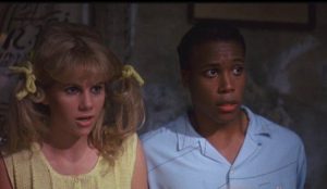 An interesting parallel to Allison is Wanda Woodward (Traci Lords), a female member of Cry-Baby’s crew. Her ultra-square parents (David Nelson and Patricia Hearst) actually try to ship her off to Sweden after she has a run-in with the local law. She responds by leaving home, a la Dawn Davenport, and is predictably set upon by another Big Bad Wolf, sleazy pornographer Toe-Joe (Alan Wendl). She unwisely accepts a ride in his hot pink 1952 Kaiser Manhattan but fortunately does not fall permanently into his clutches. (Dawn is impregnated by her Big Bad Wolf, with disastrous consequences.) Cry-Baby is again full of fairy tale and nursery rhyme references; there’s even a pivotal sequence set at a theme park called the Enchanted Forest.