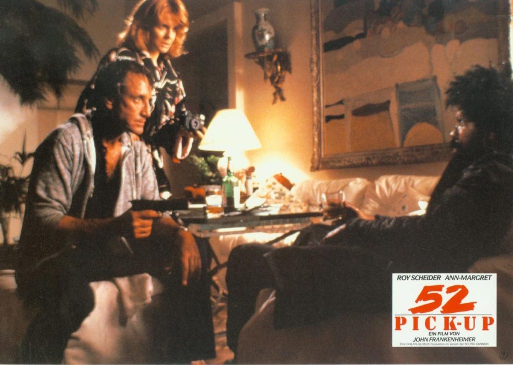 The sleaziest major Hollywood release of 1986, John Frankenheimer’s 52 Pick-Up is an ugly, urgent thriller made by a director with something to prove. Based on Elmore Leonard’s 1974 novel, it’s about what happens when a trio of low-rent, wannabe criminal masterminds try to blackmail the wrong guy. Roy Scheider stars as Harry Mitchell, a self-made Los Angeles machine parts magnate who isn’t too many years off the assembly line himself. These days Harry drives a vintage Jaguar and lives in a fancy house with a pool, while his wife Barbara (Ann-Margret) is a well-respected philanthropist being groomed to run for office. But we can tell Harry’s still a little rough around the edges because he’s seen drinking a beer in nearly every scene. Lately he’s been running around with a 22-year-old nude model (‘80s dreamgirl Kelly Preston) and that’s why our three skeezy operators try to make their move. Big mistake.