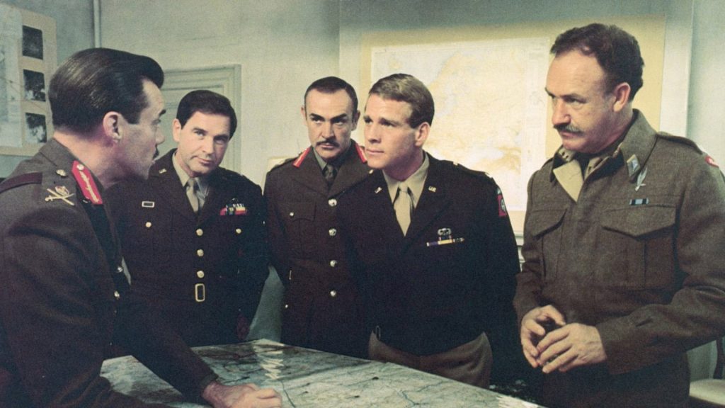 And it’s fascinating to watch what each of them does to stand out in that cast. Connery leans in to what he does well, adopting his go-to gruff, man-of-action pose and serving as the first line of reaction when things start to go south. Hackman, never really known for his dialect work, tries out a none-too-convincing Polish accent, but he gets off some good lines. Gould decides to ham it up, and does it with such verve that you allow it; few things in the film are as delightful as the mere sight of the M*A*S*H star chomping his cigar, leading a brigade, and barking “schmuck” at people. Caan wisely underplays – he knows you’re not gonna out-“act” any of these guys – and ends up with one of the most memorable scenes in the picture. And an absurdly young Anthony Hopkins is wonderful as an officer who discovers that his inclinations towards politeness may not serve him well in a battle situation (“Look here, I’m awfully sorry, but I’m afraid we’re going to have to occupy your house”). Redford doesn’t show up until the 125-minute mark, and by then, you’ve likely forgotten he’s in the movie – but there he is, looking tan and golden-haired and, well, just like Robert Redford.