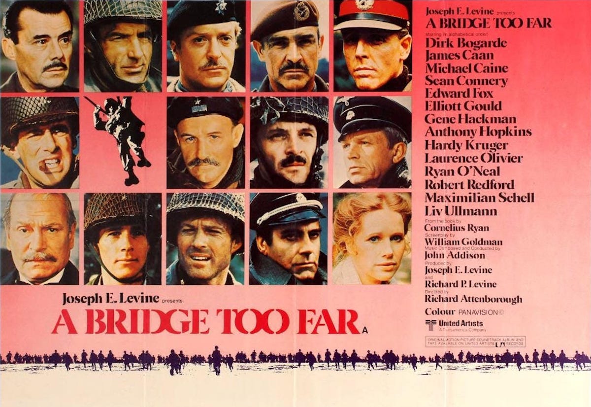 And they did: as alphabetized in the credits and posters, A Bridge Too Far stars Dirk Bogarde, James Caan, Michael Caine, Sean Connery, Edward Fox, Elliott Gould, Gene Hackman, Anthony Hopkins, Hardy Krüger, Laurence Olivier, Ryan O’Neal, Robert Redford, Maximilian Schell, and Liv Ullmann. It doesn’t matter that so few of them share scenes (though a handful do), or that they sometimes seem to be acting in different movies. The sheer wattage of the star power is stunning. (The ubiquity of Hackman and Caine in the subsequent decade’s films was so often noted that it became a running gag in the 1993 comedy PCU, in which a student is working on a theory that a film by one or the other is always on television; late in the movie, he discovers an airing of A Bridge Too Far and announces, “This is my thesis, man! This is my closing argument!”)