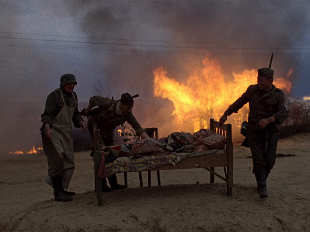 The acts of casual brutality and sneering intimidation that Flyora both witnesses and is subjected to as their captive are horrifying, and Aleksei Rodionov’s camera does not blink. Though there are moments of stunning beauty here (including a handful of gasp-inducing split diopter shots), Rodionov and Klimov are more concerned with using the camera to capture the experience, via flashes of nightmare imagery and carefully composed, subjective close-ups, tight and involving. (An unexpected hard cut, late in the film, to archival newsreel footage is also devastating.) The immersive sound design further pushes us into Flyora’s wrecked headspace; one moment in particular sticks in this viewer’s mind, with flames, gunfire, music and screams, horrible screams, battling for bandwidth on the soundtrack. It’s unshakable.