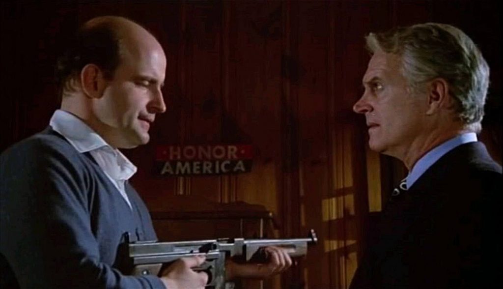 Over the course of several days, Joe is the ferryman to Bill’s voyage into a spiritual crisis. They forge an uneasy friendship over Frank’s murder, which Joe endorses as a civic duty. Conversely, Joe doesn’t ever quite figure out that his upper class “friend” regularly regards him with disgust, exchanging looks with his wife every time Joe makes a social faux pas at dinner and merely tolerating his lowbrow humor as a means to an end—Joe is a buffer to the dark sentiments that reside under Bill’s bourgeois haircut and designer suit. Bill’s revulsion is less towards Joe’s hoi-polloi mannerisms and more towards the dark sentiments of his that he sees reflected and intensified in the hard-hat goon beside him.