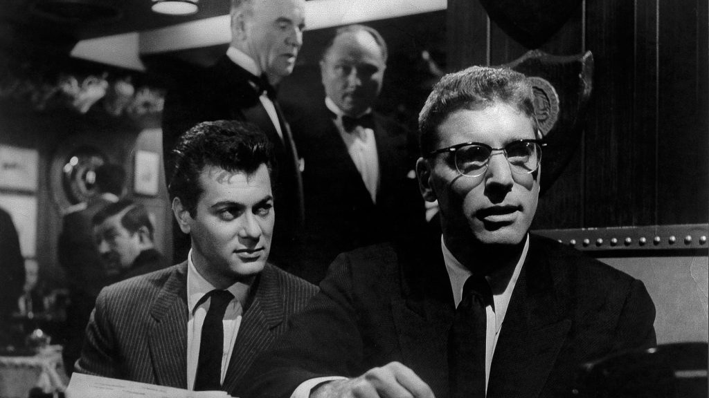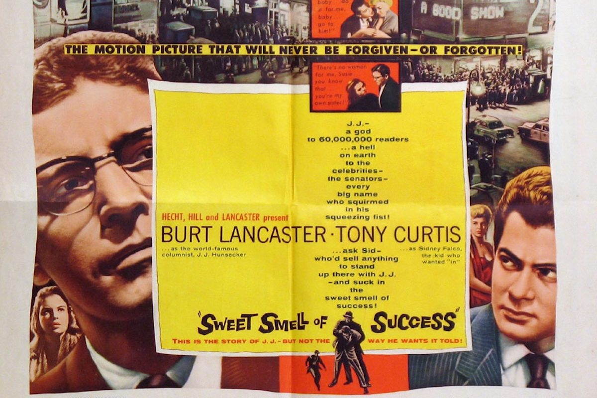 Tony Curtis stars as Sidney Falco, a small-time publicist and inveterate hustler so low on the showbiz totem pole that his office (where he also sleeps) doesn’t even have his name painted on the door, just a cardboard sign. Sidney schemes to get his clients mentioned by Burt Lancaster’s kingmaker columnist, the immortally named J.J. Hunsecker, who rules New York City nightlife like a feudal lord. Long before we meet the character, we see a logo of his ominous eyeglasses looming over the action on Broadway billboards and passing news trucks, overseeing everything like if Dr. T.J. Eckleberg was a terrifying asshole.