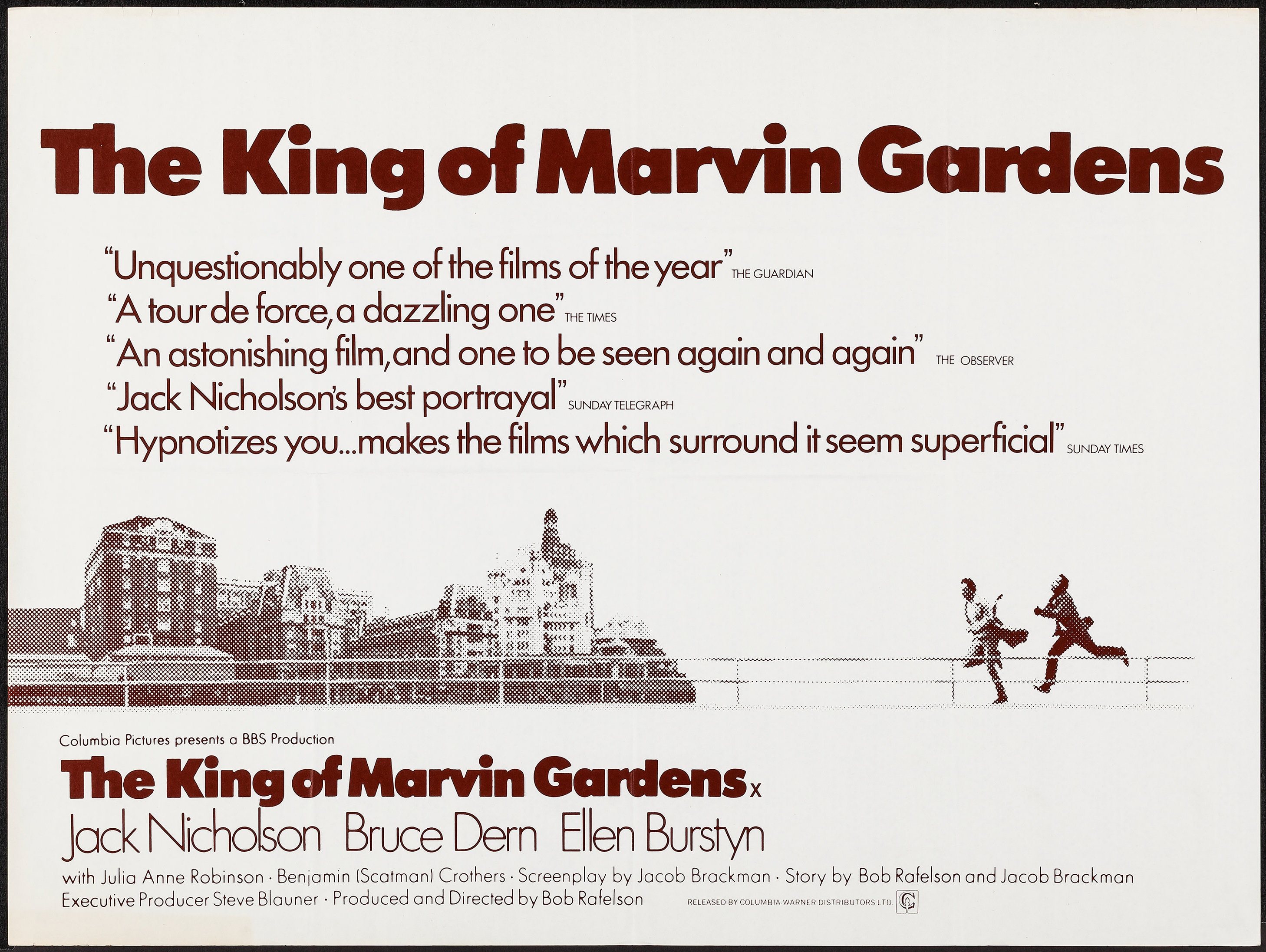 The King of Marvin Gardens was the beginning of the end for BBS Productions, the company via which Rafelson, Bert Schneider and Stephen Blauner had parlayed their success with TV’s The Monkees into the launch pad for an entirely new era of adventurous Hollywood cinema, producing Easy Rider, Five Easy Pieces and The Last Picture Show. With its gallery of losers, emphasis on character and atmosphere over incident, and occasionally inscrutable symbolism (why again are David and Jason having that conversation on horseback?), The King of Marvin Gardens is the kind of movie people mean when they describe something as “a ‘70s movie.” As the years wear on, the gorgeously decaying setting seems even more appropriate for a sort of film that’s sorely missed.