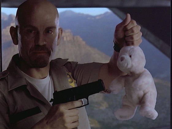 There are many reasons why Face/Off works better than Con Air, but they are exemplified by the different ways they use Cage. Con Air is a much simpler movie, with black-and-white morality. It begins by establishing that Cage’s character, Cameron Poe, is a good guy despite being in jail. He’s played as a saint the whole time, different from all the other criminals on that plane. And since all of the villains are pitched at such a mustache-twirling level of evil, Cage has to play Poe quiet and low-key. Aside from a horrible Southern accent, it’s just a typical action-hero role that doesn’t need Cage to be brought to life.