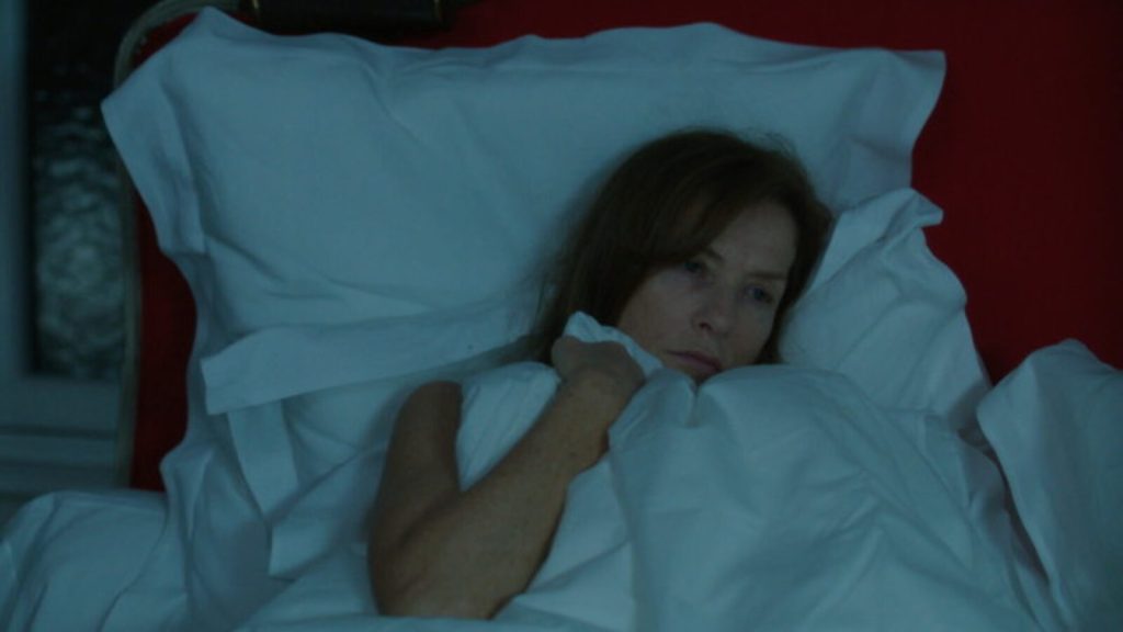 Beginning with her attack, the portrait of Maud is stirring and unsparing. Huppert, completely lacking in vanity, captures Maud’s gaping horror as her limbs start betraying her. In a particularly low moment, she pleads with an occupational therapist to help her learn to laugh again. She stares at herself in a hand mirror, dutifully trying to form her mouth into the proper shapes. Maud’s illness makes both large and small claims on her life: there are many indignities involved in simply going shopping or trying to make a salad. Yet Maud remains determined to return to her old life and continue with her filmmaking. As a result of the attack, her left hand is initially stuck in a closed fist—an emphatic (but also pathetic) symbol of her determination to regain some control over her life.