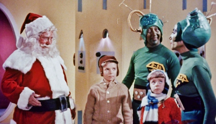 The most notorious of the three is Santa Claus Conquers the Martians, which was roundly mocked on Mystery Science Theater 3000 in 1991. Made at a time when the space race between the United States and the Soviet Union was heating up, the film doesn’t even hint at making its green-skinned aliens analogues for the Russians. Instead, its kid-friendly plot posits them as a race whose children are all morose and lethargic because they’ve forgotten how to have fun (or, to be more precise, they never learned in the first place). The solution, provided to Martian ruler Kimar (short for King Martian) by 800-year-old wise man Chochem, is to give the children of Mars a Santa Claus to match the one they’ve seen on television (which picks up Earth programs like the interminable visit to Santa’s workshop that opens the movie). Kimar decides that nothing less than the genuine article will do, though, and leads of small raiding party to Earth so they can abduct Kris Kringle and put him to work for them.
