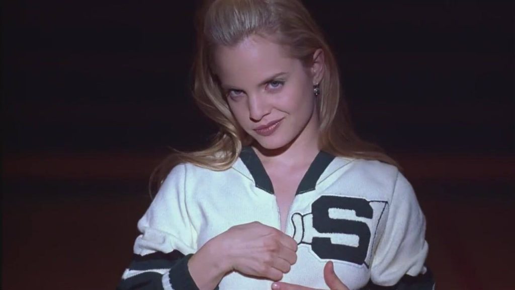 Another example comes in American Beauty (1999) and its character Angela (Mena Suvari). She imitates sexual prowess to distract from her own innate vulnerability, and one-ups the experiences of her best friend Jane to hide her insecurities. She discusses her sexual misadventures in graphic and voyeuristic detail, and uses Jane’s father Lester’s sexual desire for her to keep Jane under her thumb. By the end of the film, when she almost succumbs to Lester’s newfound individuality and lease on life, she confesses her virginal status; instead of sleeping together, they discuss the frustrations and limitations of their suburban lives.