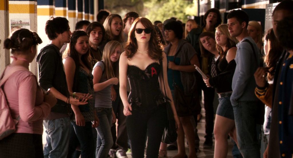 A paradigm of the “slut-that-never-was” comes in the form of the good-natured Olive (Emma Stone) in Easy A (2010). She is, in all regards, a typical school girl – we first meet her as she sings in the shower and dances on her bed to a birthday card that plays “Pocketful of Sunshine.” This is a nice girl. She’d never do anything to damage that, would she?