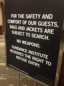 Something they flirted with last year that seems to be in full force this year is security checks, at public screenings as well as P&Is (press and industry). Before you can enter the theater, you have to open your jacket and backpack or purse so that a guy can glance at them. The guy I asked said they are checking for guns. So be warned: the only way you’ll be able to bring a gun into a Sundance movie is if you, like, hide it. Like in your pants pocket, or an inner coat pocket, or at the bottom of your backpack or purse. But if you have it strapped to your chest, or you’re just waving it around? BUSTED.