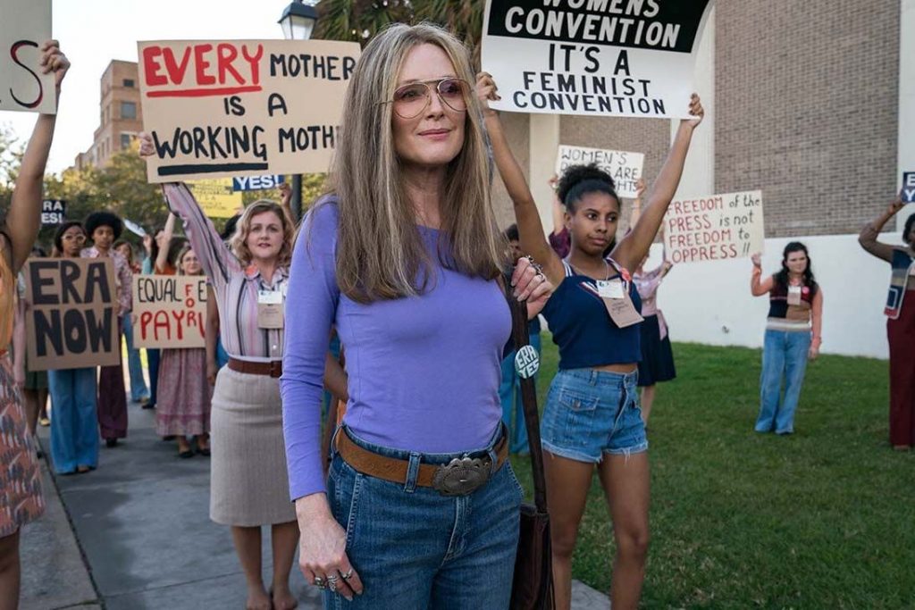 The Glorias is a biopic of Gloria Steinem and the women’s movement up to the present day, with four actresses playing her at different ages: little girl, tween, young woman (she’s Alicia Vikander there), and adult (now she’s Julianne Moore). The director is Julie Taymor, the stage director who’s made a few visually inventive movies (Titus, Frida, Across the Universe). The Glorias is pretty straightforward, though, with just a few Taymorian flights of fancy and a narrative device that I liked where the different Glorias interact and question one another on a metaphysical bus.