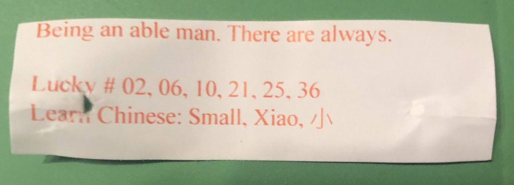 A great deal of writing occurred here, accompanied by a great deal of complaining about the music that was playing on the Yarrow’s sound system. We used to complain about the spotty wifi, but the wifi’s pretty good now, so we have to complain about the music. Then it was dinner at the Chinese/Thai place, where I received this truly prescient fortune cookie:
