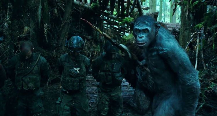 War for the Planet of the Apes opens with scenes that are familiar to American viewers: soldiers silently work their way through the jungle, looking for the enemy. The camera angle switches and they pull up short: three Kong have been spotted on the hill. The soldiers’ helmets are scrawled with slogans for morale, and we already get the sense we’ll hear a Jimi Hendrix song.