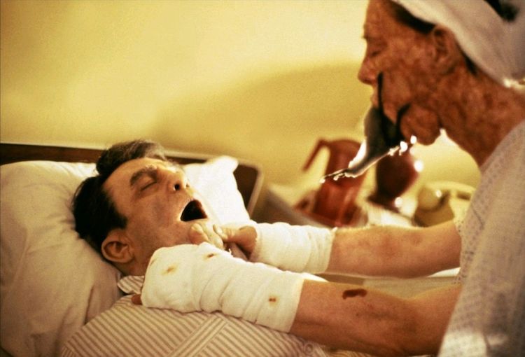 In a bit of symmetry that must’ve been deliberate, Donald Pleasance plays a psychiatrist like he did in Halloween, but the similarities end there. Here, Pleasance calls his patients “voyagers” and envies their journey into deeper, stranger forms of consciousness as he puffs from a feather-adorned peace pipe. Whenever a voyager acts out, he either enables their psychosis or whispers a violent, awfully familiar threat. The faded line between doctor and patient is summed up best early on, when the de facto hero, a more traditional psychiatrist played by Dwight Schultz, breaks a vase as his family moves in.