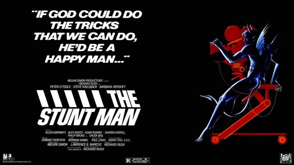 It cost Richard Rush ten years and two heart attacks to answer them with The Stunt Man, the story of an escaped convict hiding out in plain sight on a movie set as the blackmailed plaything of an omnipotent director who travels exclusively by crane-mounted hand of God. The 1973 novel on which it was based, by New Yorker staff writer Paul Brodeur, was enough of a Rorschach test to attract filmmakers as far afield as Arthur Penn and Francois Truffaut. Columbia Pictures wanted a straight-ahead action movie. Rush, a graduate of UCLA’s first film program who cut his teeth on Air Force training films and AIP motorcycle movies, saw more to it than that. As a result, Columbia passed on his script for coloring outside the lines of any definable genre. It would be the first Sisyphean slip on the hill toward production and a forecast of fate already sealed.