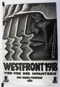 Universal Studios eagerly bought the film rights to the global best-seller All Quiet on the Western Front and assembled a well-financed American production, which won the Academy Award for Best Picture. Westfront 1918 was produced in Germany, directed by Georg Pabst and WWI veteran/actor Gustav Diessl, both of whom spent time in POW camps. Tonally speaking, All Quiet is more sentimental whereas Westfront 1918 is bleaker in outlook, owing perhaps to Pabst’s central role in the German Neue Sachlichkeit (New Objectivity) movement, which rejected romantic idealism and promoted realism. The Criterion DVD of Westfront 1918 has a 1969 roundtable discussion of a group of WWI veterans. They point out that the film’s German perspective is important because the German troops were more shocked and dismayed at the war’s end. They had entered the conflict certain of victory, yet postwar, doubted everything they heard.
