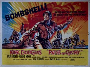 While La Grande Illusion was a rather light, yet still potent film, 20 years later, Stanley Kubrick’s Paths of Glory (1957) premiered with a darker tone and stronger antiwar message than preceding WWI films. This was Kubrick’s attempt to grab the attention of a very jaded, war-weary public. By the time Paths of Glory premiered in 1957, the world had suffered through WWII and the Korean War and was now teetering on the brink of thermonuclear destruction in the Cold War. The film mirrors a historical event, which took place on the western front in 1915. Gen. Mireau (George Macready), representing the actual Gen. Giraud Reveilhac, orders his own artillery to fire on the French troops, cowering in the trenches, to force them to attack the Germans. As actually occurred, four corporals, chosen from the ranks at random, face conviction on counts of mutiny and gross cowardice, followed by execution. Kubrick’s gruesome portrayal of war is consistent with the images evoked in Cobb’s novel of the same title. Cobb contended, “The only available effective antiwar propaganda that I know is photographs of butchered bodies, the more horrible the better.”
