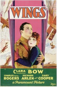 Nine years after the armistice, time had healed the wounds of war enough for more nostalgic endeavors. Americans were fascinated with aviation, and at the same time that Charles Lindbergh was making his transatlantic flight, William A. Wellman, a WWI combat pilot, was directing Wings (1927), a tribute to the young heroes of the U.S. Army Air Service in WWI. Wings ushered in the age of mutual exploitation between cinema and the military. Interested in bolstering Army recruitment in an American society pacified by successful completion of the war to end all wars, the Army lent Paramount 3,000 soldiers, hundreds of planes, tanks, artillery, and four bases in the San Antonio area. This contribution from the Army had an estimated value of $16 million — $232 million in today’s dollars. Add to that a budget of $2 million and a nude scene by glamorous actress Clara Bow, and the result was a blockbuster, earning the first Academy Award for Best Picture. The aerial combat sequences are the highlight of the film, and they remain marvels of choreography and cinematography, though the ground battle scenes lack the gritty realism of later WWI films. Wings, a piece of revisionist romanticism, is a prototype Top Gun (1986), complete with the rivalry of allied pilots, the death of a fellow pilot, and the love interest who evades said young pilot.
