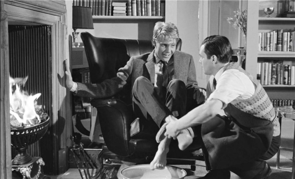 James Fox (the patriarch of a prominent and controversial British acting dynasty) plays Tony, a happy-go-lucky rich boy who doesn’t seem to do much but has cash a-plenty in his pockets. As is the right thing to do for gentlemen like him, he hires a manservant. Hugo Barrett (Dirk Bogarde) is seemingly perfect: hard-working, dutiful, and docile. Tony’s girlfriend Susan is suspicious of him, and rightly so. Barrett is scheming with his lover Vera, who he passes off as his sister to gain her employment in Tony’s home, to all but devour his employer. Soon enough, Tony is a drunken waste of space, utterly dependent on the manservant who has flipped the dynamic to become the master.