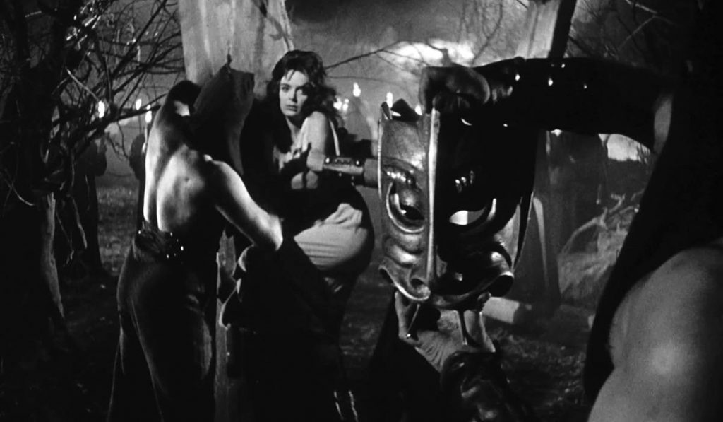 Using a story by Russian author Nikolay Gogol as their basis, Bava and his co-writers fashioned the quintessential Gothic horror tale, set in a foreboding castle surrounded by a perpetually fog-enshrouded forest. He also had an ace up his sleeve in the form of English actress Barbara Steele, who became a horror icon on the strength of her dual performance as Princess Asa and her doomed doppelganger, Katja. With her piercing stare and otherworldly presence, Steele was frequently called upon in the years to come to play seductive villains, but she followed her turn as the innocent Katja with the occasional sympathetic role as well. When Katja is introduced, though, she’s dressed completely in black and seen silhouetted in the distance with two ferocious-looking dogs at her heels, so even her “good” character in Black Sunday appears to have a dark side.