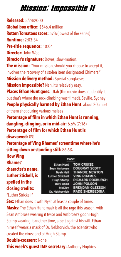 NOTES: After not firing a gun at all in the first movie, Ethan shoots a whole bunch of dudes in this one — by far his biggest body count of the series. Between that and the introduction of a love interest, it starts to feel like a James Bond movie. That might be why this one got the worst reviews and has the worst reputation of the franchise: We already have a 007; we were hoping for something else. It is notable that this is the only casual sex Ethan has in the whole franchise, and that the woman he sleeps with doesn’t die afterward. James Bond he ain’t.