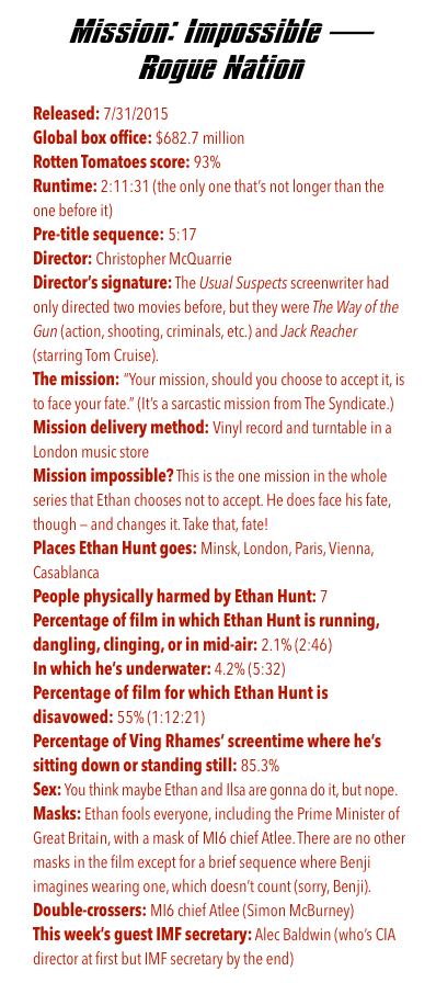 THE MOVIE: Because of the destructive events of the previous film, a Senate committee disbands the IMF at the insistence of CIA head Alan Hunley (Alec Baldwin) — bad timing, because Ethan Hunt and his pals are this close to finding The Syndicate, an international criminal operation that the CIA thinks is just a ghost story IMF agents tell their kids. (Joke’s on them — IMF agents don’t have children!) Ethan goes off the grid for six months, then enlists Benji to help take down The Syndicate, aided by Ilsa Faust (Rebecca Ferguson), a disavowed MI6 agent who was working undercover for Syndicate leader Solomon Lane (Sean Harris). Everyone has to go to the opera, but it’s more exciting than you’d expect, what with the assassination attempts. Brandt, instinctively knowing to trust Ethan over Hunley, gets Luther involved. They end up having to kidnap the British Prime Minister (Tom Hollander), who confirms The Syndicate exists but is surprised to learn that it’s actually up and running since he vetoed it when MI6 suggested it. Solomon Lane is captured so he can be the first villain in the series to appear in more than one movie. Hunley goes back to the Senate committee and is like, “Yeah, shutting down the IMF was part of a secret plan, we need it back now, thank you,” and the Senate goes along with it because they’re a bunch of chumps.