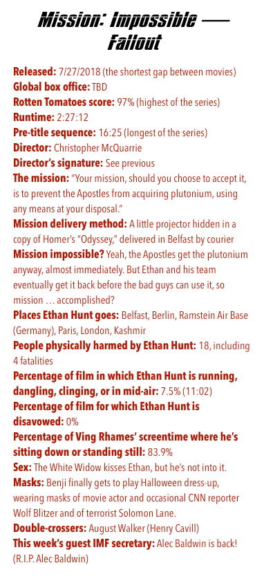NOTES: Ethan Hunt is only running, dangling, clinging, or in mid-air for 2.1% of this movie, his lowest of the series. Instead, he spends 4.2% of the movie — five and a half minutes — underwater.