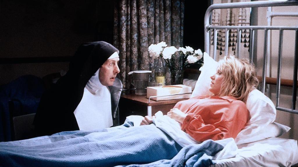 Oh, yes. And when their getaway car runs out of petrol outside a convent attached to a teacher’s college, Brian and Charlie have to pose as nuns – the hastily named Sister Euphemia of the Five Wounds and Sister Inviolata of the Immaculate Conception – until they’re able to make off with the money.