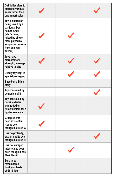 It has escaped few moviegoers’ notice that within the last week three movies about sentient dolls have been released: Toy Story 4, Child’s Play, and Annabelle Comes Home. Given the chaotic nature of multiplexes and the incompetence of parents, it’s easy to see how confusion may arise. And so, in response to an emergency request from the MPAA, we issue the following graphic to help you tell these similar movies apart.