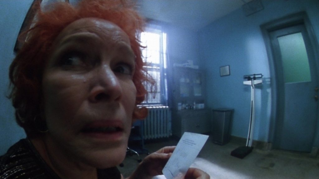 As the widowed mother further descends into delirium, the cinematic eye becomes more distorted. Fish-eye lensing, harness-mounted cameras, and grainy film textures showcase her deteriorating state of mind. After she hallucinates her refrigerator, Sara flees her home and roams along the frigid, snow-covered streets of Brooklyn, raving that she’s going to be on TV. Her hair is grungy and matted, the roots grown out. Her treasured red dress hangs off of her body, the bottom hem filthy with mud and sweat in a devastating testimonial to how far gone she is. Her appearance was one of the most important things in the world to her, and now she is a hot mess.
