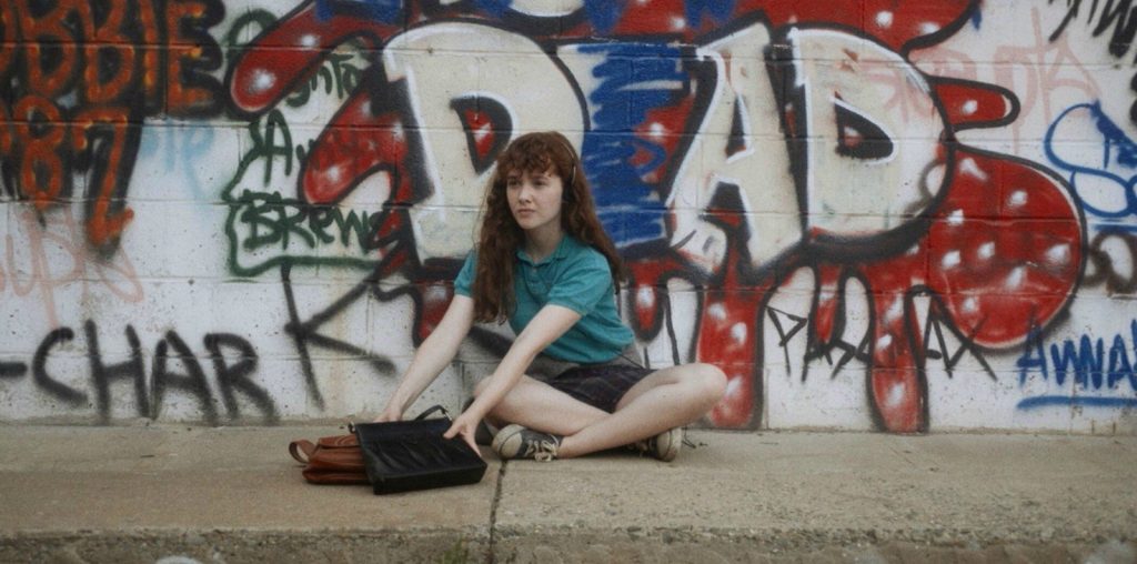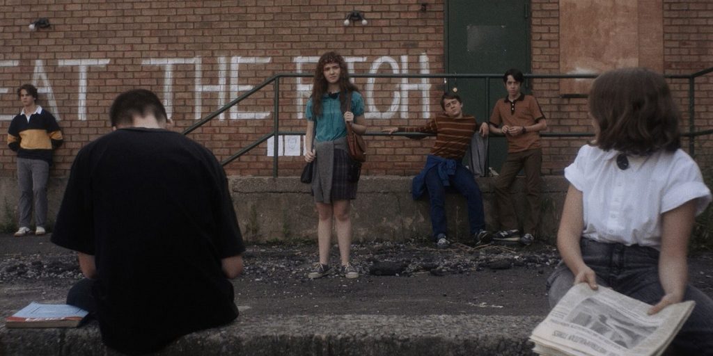 Set in 1984 in the fictional New England town of Brighton, the movie focuses on a group of eighth-graders trying to get into the club, but they have to wait before the high-schoolers get in first. Just like the teen movies of that era, it’s a gallery of pinchable palefaces. First up, we’ve got white shoe-wearing overachiever Shel (Tanner Flood) and his slightly older-looking pal Brad (Oliver Gifford). (It took me a hot minute to realize they weren’t brothers.) Also in the back are bickering buds Dean (Nolan Lyons) and Peter (Sam McCarthy). Missy (Taylor Richardson) is also back there, listening to U2 on her Walkman, while Kira (Ivy Miller) antagonizes everyone and her fellow partner-in-weirdness James (Erich Schuett) sketches portraits of recently deceased teens in the area.