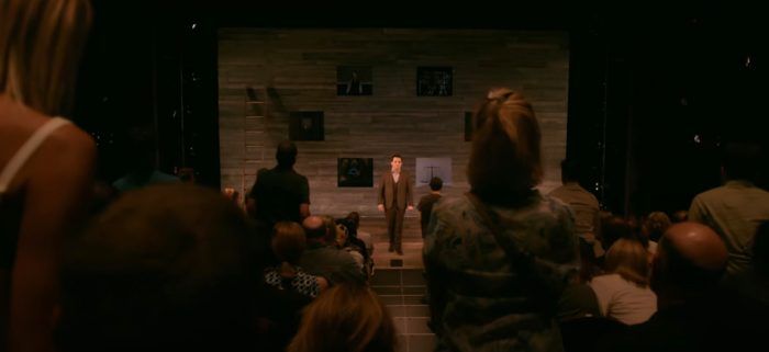 To present how the show changes night-to-night depending on its audience, Oz eschews the pretense of this being “one” performance. Montages are created that bleed together several showings, displaying a wide array of audience responses, including surprising cameos from the likes of Tim Gunn, Larry Wilmore, and Bill Gates. To make us feel a part of the crowd, Oz offers some shots that have obstructed views, specifically the intruding heads of audience members sitting before us. Then, he’ll leap closer than any of this in-person audience can get, sweeping into close-ups of DelGaudio’s face, earnest, ardent, and professing with every pore. This tapestry of cinematography knits together so snugly that we feel as if we truly are in the thick of that room – so much so that when the house lights go down, your flesh may goose-pimple as the temperature drops. You don’t just hear the hush of the audience, holding their breath for the next revelation. You realize you’re holding your breath too, in perfect syncopation with this communal experience superbly captured.