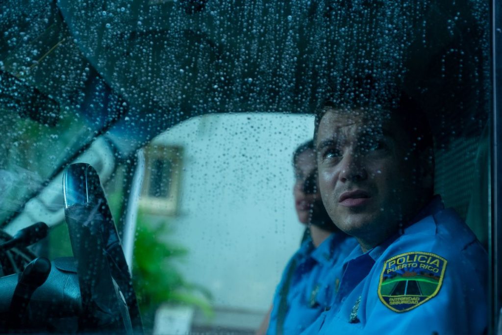 Although Gibson has been prominently featured in the movie’s marketing materials, his role here is closer to the kind of work that Bruce Willis has been churning out in direct-to-VOD thrillers over the past several years, a fairly small supporting part that allows him to coast on star power. Hirsch is the real star, playing Cardillo, a San Juan beat cop with a massive chip on his shoulder who’s been busted down to evacuation duty during the hurricane. He’s resentful of the very people he’s meant to be protecting, refusing to learn a word of Spanish and telling his eager, newly assigned partner Jess (Stephanie Cayo) that it’s not worth bothering to help anyone evacuate, since they’ll just file a frivolous complaint with the department. She has to practically drag him to an apartment building where a couple of residents are refusing to leave, and even then he can’t bring himself to care until a group of armed robbers show up.