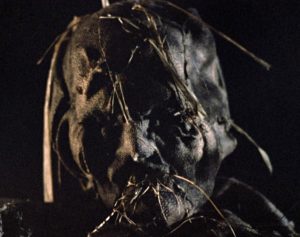 As killer scarecrows go, Bubba doesn’t get a great deal of screen time. The opposite is true in 1988’s Scarecrows, although co-writer/director William Wesley does wait until a quarter of its 83-minute running time has elapsed before showing one of his trio of homicidal straw men claiming their first victim. To make up for this, he does favor them with plenty of lingering close-ups accompanied by composer Terry Plumeri’s ominous score, showing off the work of special make-up effects artist Norman Cabrera, who does an amazing job considering he had a paltry $5,000 budget and was still in his teens when Wesley hired him.
