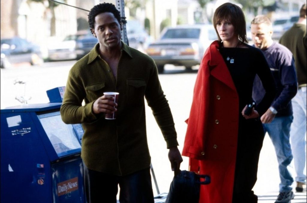 The in-jokes start early, in fact, since Pitt appears twice – on the covers of two different editions of the magazine Carl writes for – before he shows up in the flesh alongside Nicholas, a TV actor making the transition into features, much like Underwood, Pierce, and Duchovny were. Nicholas also regales Catherine with a well-rehearsed rap/monologue about the challenges faced by black actors in Hollywood, during which he slyly references two of Roberts’s films.