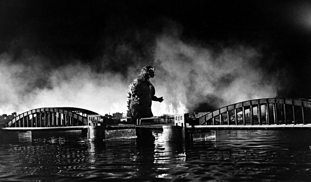 As it happens, Odo Island is near the shipping lanes where a number of commercial vessels have gone down. The mystery of the capsized boats and their missing crews only takes up 20 minutes of screen time, but it is given extra weight by the casting of Takashi Shimura (erstwhile leader of Akira Kurosawa’s Seven Samurai, Toho’s second-most-expensive production of the year) as a paleontologist on the scene. It is during his investigation that Godzilla finally rears its head, causing Shimura’s team and the locals to flee in terror. In many ways, the shot of Godzilla peeking its head over the hill is the make-or-break moment. If it had provoked peals of laughter, the film would have been dead in the water and not led to a franchise 30 titles deep. Rather, it inspired awe and wonder, as did the destruction visited upon Tsuburaya’s highly detailed models, which set a high bar for all the rubber-suited monsters that followed in Godzilla’s wake – at home and abroad.