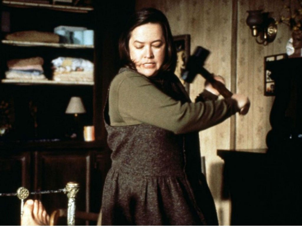 Misery is the story of a man trying to move forward and a monster keeping him immobile. Gothic romance novelist Paul Sheldon (James Caan) has penned a highly lucrative series of Victorian bodice-rippers featuring a popular character named Misery Chastain. Misery has bought his vacation home and paid his kid’s tuition, but Paul is ready to move onto more serious fare. The opening scene of the film shows his celebration routine as he types the final words on the manuscript for his latest novel: a champagne flute, a bottle of Dom Perignon, and a single cigarette with a match to light it. He checks out of the Silver Creek Lodge and, in the middle of a brutal blizzard, drives towards his home in New York City to deliver the manuscript to his agent. His car veers off the road and he is trapped, bloodied and unconscious in the snow until a figure pries open the door and pulls him out. He awakens in the home of Annie Wilkes (Bates), whose first words on screen are “I’m your number one fan. There’s nothing to worry about, you’ll be just fine. I’ll take good care of you. I’m your number one fan.” In the days following, Paul learns that Annie is not just a fan – she’s a pendulum of worship and rage, swinging constantly over his busted body. Things go poorly.
