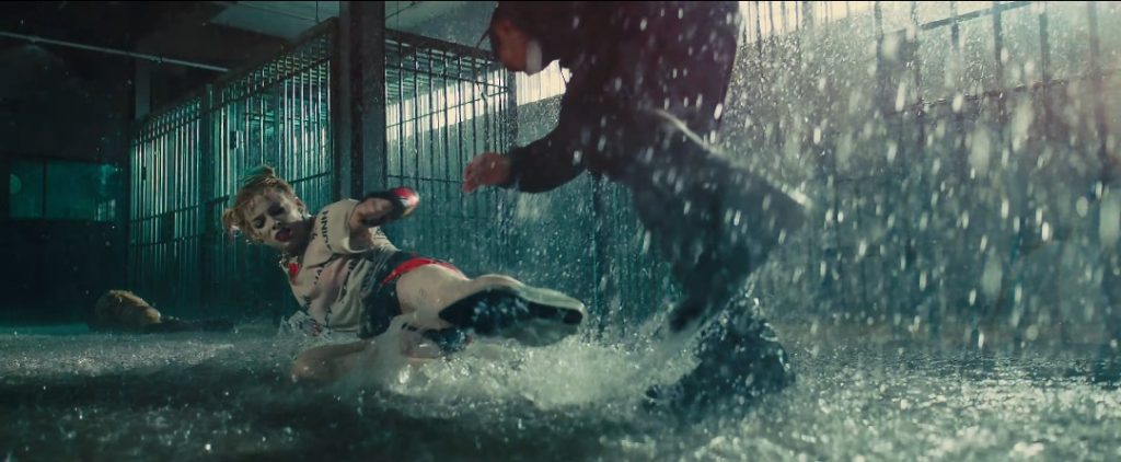 Both films also feature Harley fighting in the rain while wearing a white t-shirt. Yet the angle is striking different. In Suicide Squad, the fit of her white tee is already snug. Pair that with the push-up bra and you’ve got Robbie in a big-budget wet t-shirt contest. The water makes the shirt cling tighter to her curves and abs, drawing our eyes to the spectacle of her body. In Birds of Prey, Yan drapes Harley in an oversized white tee, shorts that actually cover her ass, and underneath that a pink bralette, designed for coverage not provocative uplift. So when Harley gets wet, the t-shirt doesn’t cling to her like a creepy ex. Instead, it sways in slow motion, slinging water droplets and drawing focus to Harley’s fighting and physicality as she flips, kicks, and smashes any dude who dares cross her. The spectacle here is her actions, not her T&A. Notably, her new tee ties back to the title and the message of emancipation from Joker’s control, because this shirt doesn’t reference him or her deadbeat dad. This shirt is plastered with three words: “Harley F*cking Quinn.”