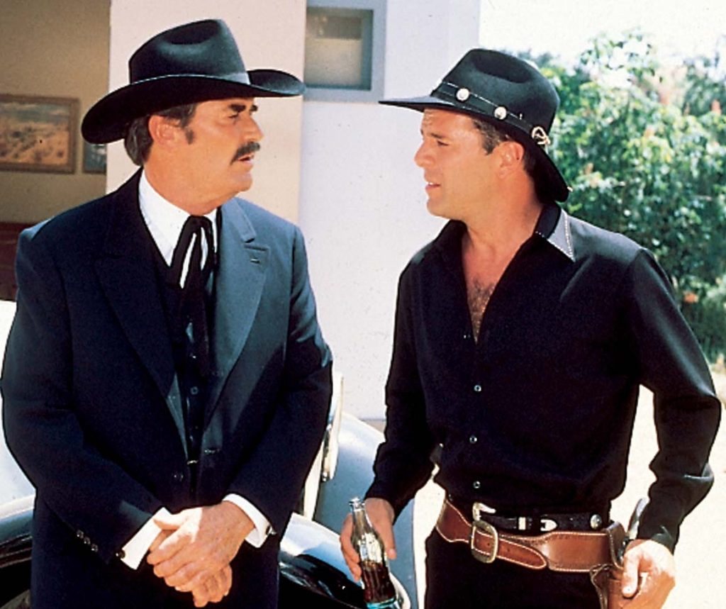 In the opening minutes of Blake Edwards’s Sunset, a dying-breed studio mogul offers silent superstar and action hero primordial Tom Mix his next project, a bet-the-studio biopic of Wyatt Earp. “I didn’t become numero uno at the box office by playing other people,” says Bruce Willis. Oh, he’s playing Mix, make no mistake; he wears the ten-gallon hat like a sign around his neck. But there’s no mistaking who’s talking and, more often, smirking. Upon release in April 1988, there was no mistaking him.