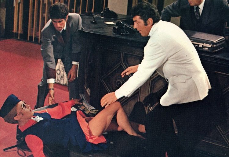 One year after Thunderball, Dino banked a bigger payroll than Sean Connery to “play” Matt Helm in The Silencers. His Matt Helm is just Dean Martin with a stunt double. He’s introduced, mid-nap, dreaming about seducing models he photographs for Playboy-knockoff “Slaygirl.” The man knows two things — women and booze. Anything else he treats with apathy or disdain. His home is a pick-up artist’s Rube Goldberg machine. A button over his bed rolls it across the floor and into a swimming pool-sized bubble bath. The oversized bar of soap hides a bottle of whiskey. Helm drinks it, then gets out and fixes another drink, but not before his personal assistant, Lovey Kravesit, joins him for a dip.
