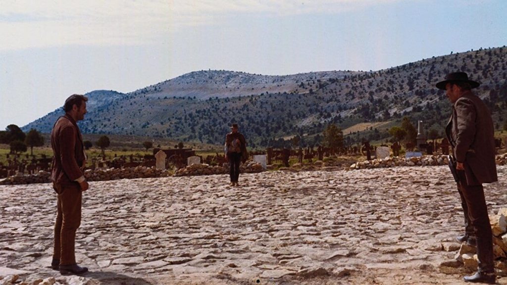 The film provides the most pointed commentary of the trilogy on Leone’s mythic view of the American West, as well as the not-so-noble Americans themselves, culminating in Morricone’s original ballad written for the film, “The Story of a Soldier.” The song underscores not only moments of tragedy during the Civil War (when the story is set) but also the torture of Tuco at the hands of Angel Eyes, solidifying the trope of sadistic violence accompanied by diegetic, beautiful music. As an ironic counterpoint, Morricone saves the most triumphant and ebullient cue not for a noble act or victory in battle, but for Tuco’s discovery of the cemetery where a treasure in gold is buried, in a piece aptly named “The Ecstasy of Gold.”