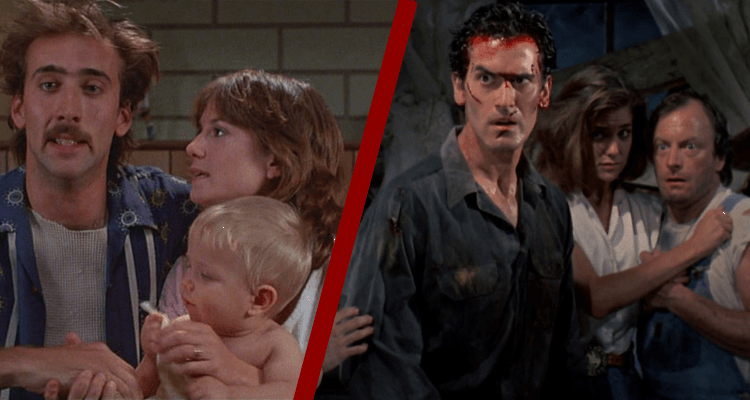 In the same vein, Evil Dead II goes from “Bruce Campbell fights demons in a cabin” to “Bruce Campbell chops off his possessed hand and replaces it with a chainsaw while household items in the cabin laugh at him” pretty damn fast. Both films go over the top, feature iconic performances from its lead actors, and play with a lot of the same cinematic techniques. In fact, both Raising Arizona and Evil Dead II feed into each other in interesting ways.