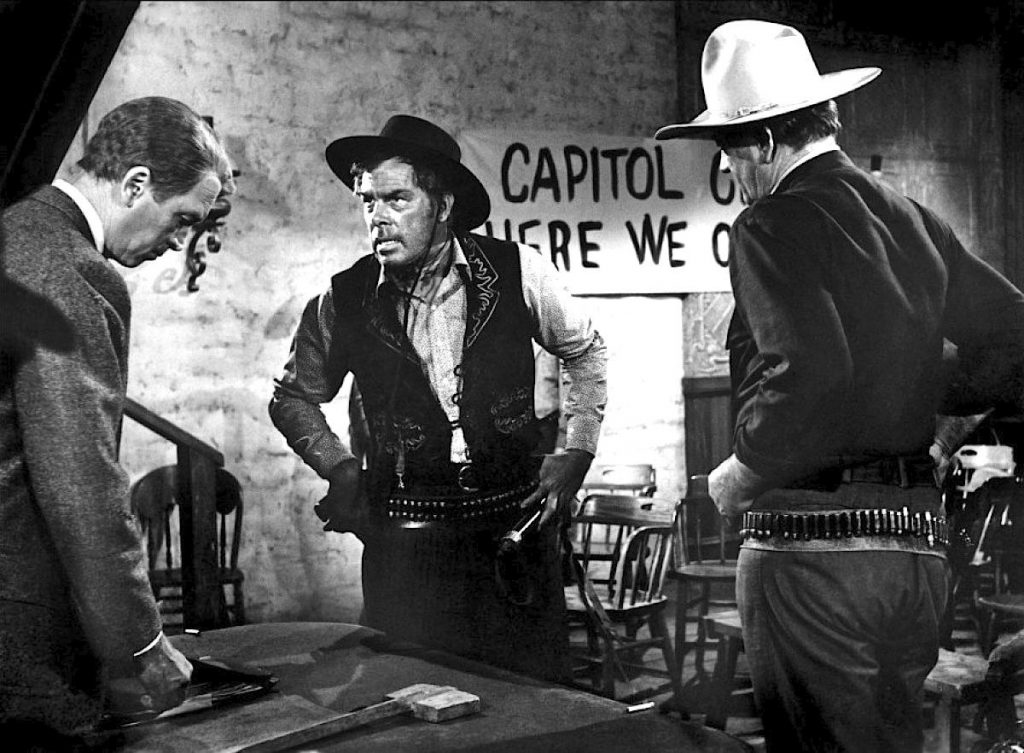 What follows is the story of Stoddard’s arrival in town as a poor, ambitious young attorney. A violent encounter with Valance reveals to Stoddard, an Easterner, the lawlessness of the West. He soon meets Doniphon and shares his plan to set up a law office and arrest Valance. While Doniphon, the only man Valance fears, admires Stoddard’s intellect, he suggests he buy a gun instead. Stoddard opts to hang up his law sign, form a school, and teach the townspeople how to read. His logic is simple: an educated public is more likely to back the law and hold the fascistic Valance accountable.