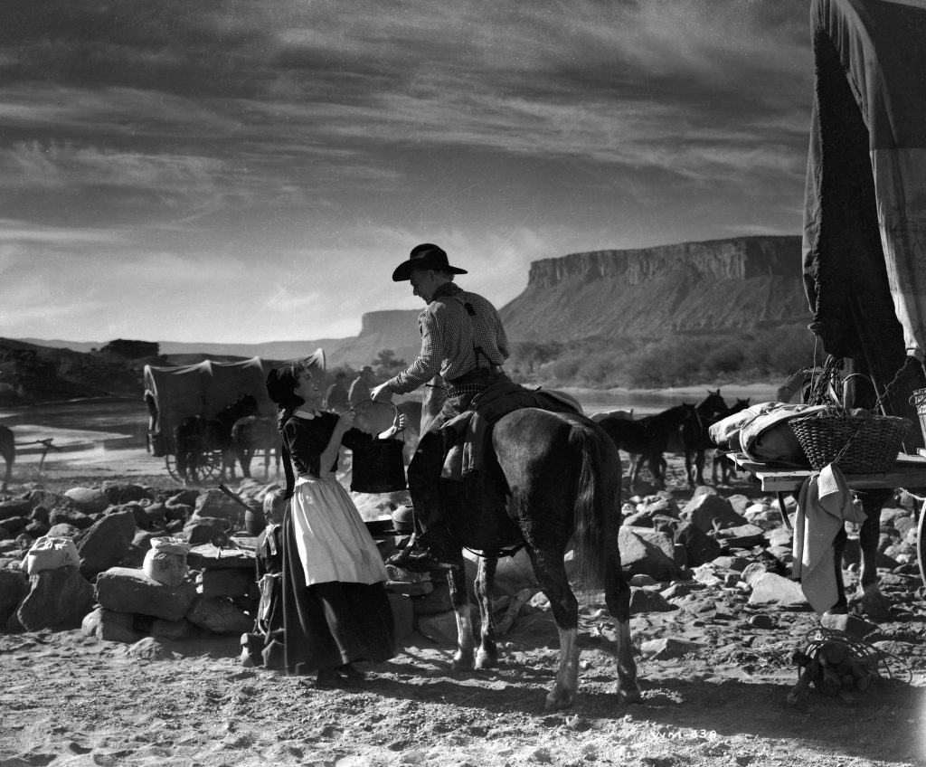 As the film starts, Mormons are being driven out of Crystal City. They’re not the only ones. “As long as they’re out of town by 7:30,” one character says, “That’s their deadline. Mormons, Cleggses, show folks, horse-traders.” He’s lumping together a killer criminal gang (the Clegg family) with harmless people who the community have deemed undesirables. The Mormons, led by Elder Wiggs (Ward Bond), are going to make their way west – a pilgrimage to the promised land over the San Juan River – but for that they’ll need a wagon master. Somebody who knows the trails. Somebody like Travis (Ben Johnson) or Sandy (Harry Carey, Jr.), a couple of young, strapping horse traders not long back from Navajo country. Though they initially turn down the job, Travis and Sandy quickly change their mind. It might be because they heard the bigoted things the townspeople had to say about them and Mormons in the same breath; it might be because they saw a pretty girl in their group; they might just have wanted to hit the road again. But once they’re out on the trails together, each of the boys immediately becomes one of them. They’re not Mormons, and there’s no implication they ever will be, but their difference includes no sense of apartness. They’re all on this journey together.